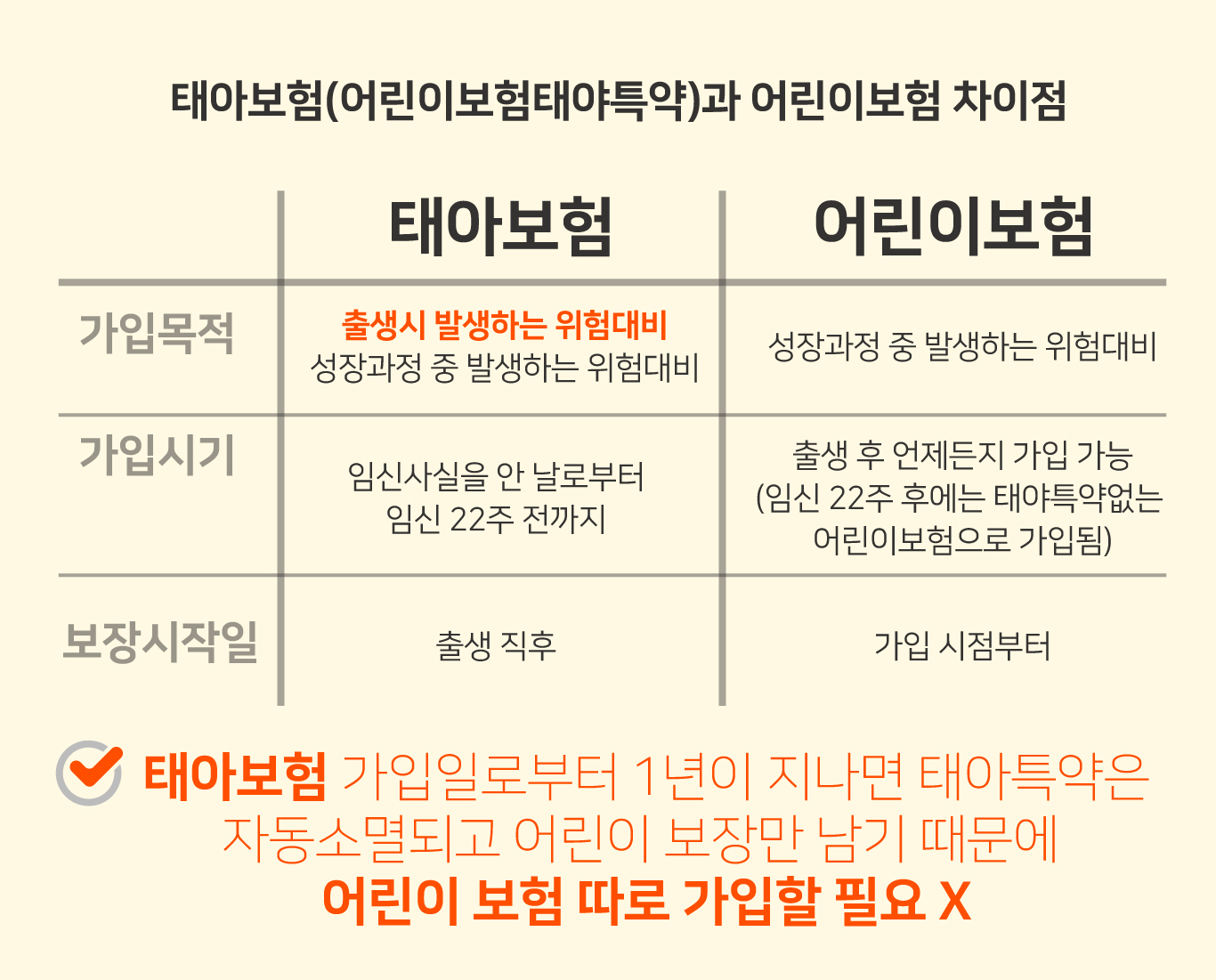 어린이보험은 출생신고 이후부터 가입이 가능하고 아이의 성장과정에서 발생할 수 있는 질병이나 사고를 보장받을 수 있다. 즉, 태아보험과 어린이보험의 차이는 태아가 출생시 발생할 수 있는 사고에 대비하는 것에 있다!